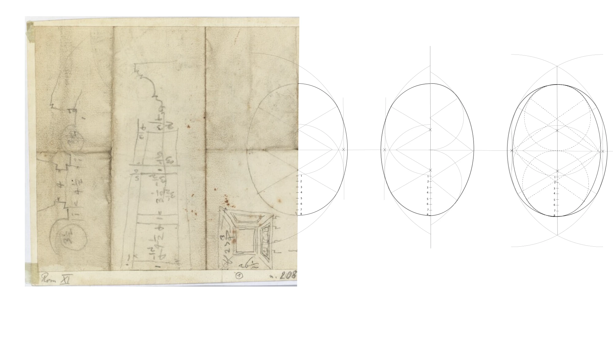 Through meticulous re-presentation of key documents spanning from 1634 to 1660, the research traces how Borromini navigated between canonical geometric principles (such as equilateral triangles and canonical ovals) and the constraints of the actual site. The study reveals that even in the earliest design phases, the church grappled with the tension between geometric perfection and constructive reality, as evidenced by dense graphite markings in experimental areas of the drawings and subsequent modifications to the building's proportions.